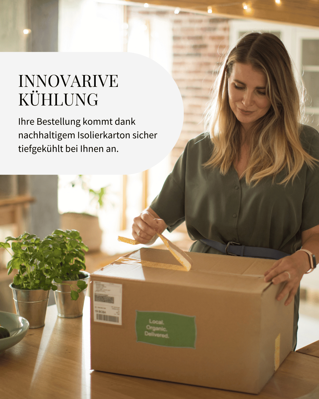 Free shipping is available for orders over €299; otherwise, the shipping cost is €19.90 (for orders up to €299) or €39.90 (for orders up to €100). Express shipping is available throughout the EU, with deep-frozen delivery in sustainable insulated packaging with cooling packs and dry ice. Delivery takes 1–2 days, always on Thursdays or Fridays. The calendar week can be freely selected. In our 100% sustainable insulated packaging, we use cold packs and dry ice to ensure an uninterrupted cold chain.